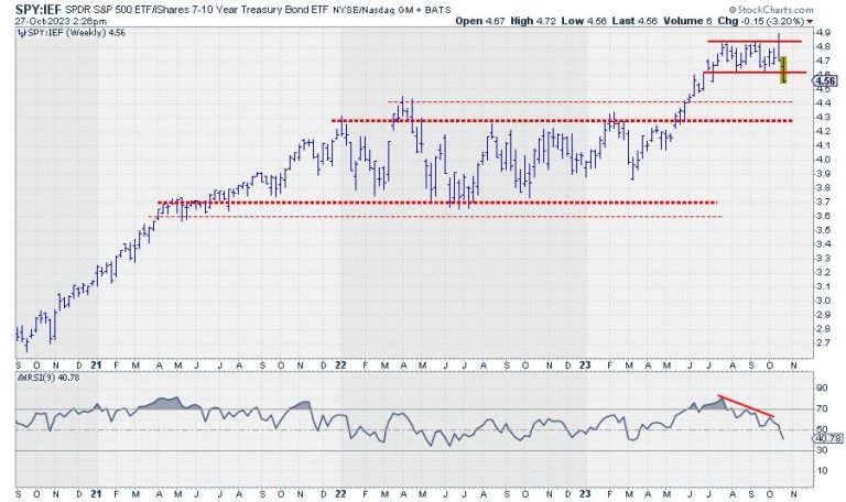 One of the metrics I keep a close eye on is the ratio between stocks and bonds. Most of the time, I use SPY:IEF. (SPY, obviously, is the ETF that tracks the S&P 500 stock index, while IEF is the ETF that tracks the prices of US Government bonds with a maturity between 7-10 years.) In Sector Spotlight, I address that ratio on a regular basis when we talk about rotations in asset classes. When the ratio moves up, stocks are outperforming bonds, and vice versa. When the ratio moves down, bonds are outperforming stocks.