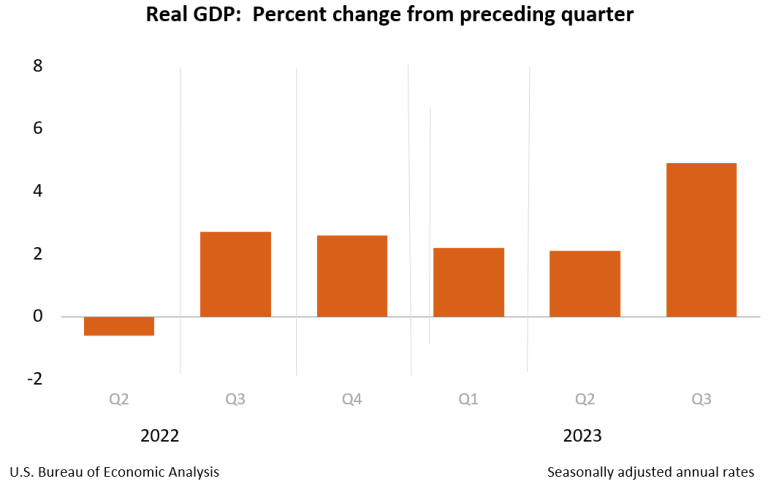 The U.S. economy grew at a 4.9% annualized rate in the third quarter that was fueled mainly by consumer spending as Americans poured their disposable income into vacations, dining out and online shopping. The pace of growth was the fastest since late 2021 and was made possible by slowing inflation and a strong jobs market. According to Fed data, there’s been an increase in wealth since Covid with the median net worth climbing 37% from early 2020 into the beginning of this year which in turn, has fueled higher consumption levels.