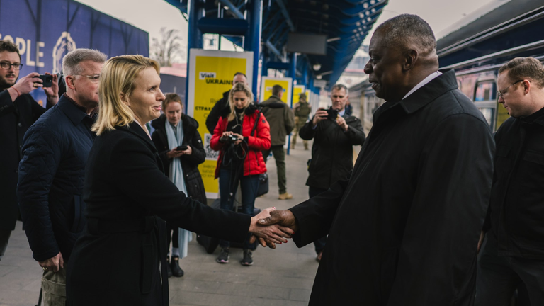 After an 11-hour train ride from Poland to Ukraine, Austin exited onto the platform, where he shook hands with U.S. Ambassador to Ukraine Bridget Brink. U.S. Defense Attaché Brig. Gen. Kipling Kahler was also present to greet him.