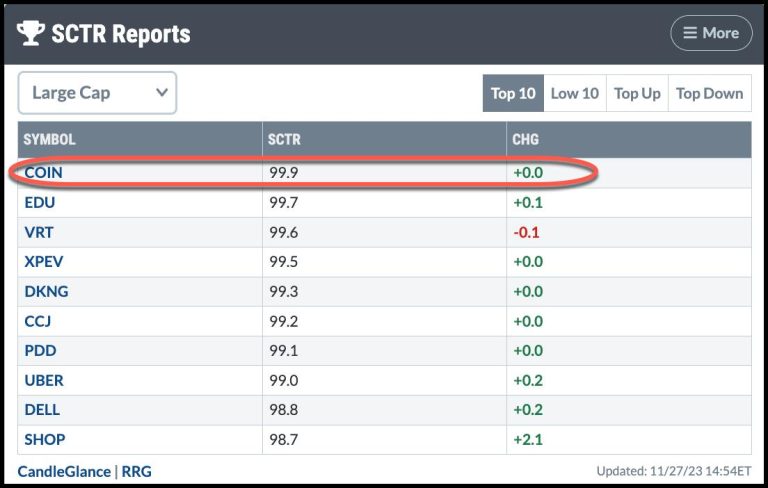 The cryptocurrency space has had its share of challenges, but Coinbase (COIN) looks like it may be setting itself apart from the pack, especially after its last earnings report on November 2. COIN’s stock price is up over 200% this year and it made it to the top position in the StockCharts Technical Rank (SCTR) score.