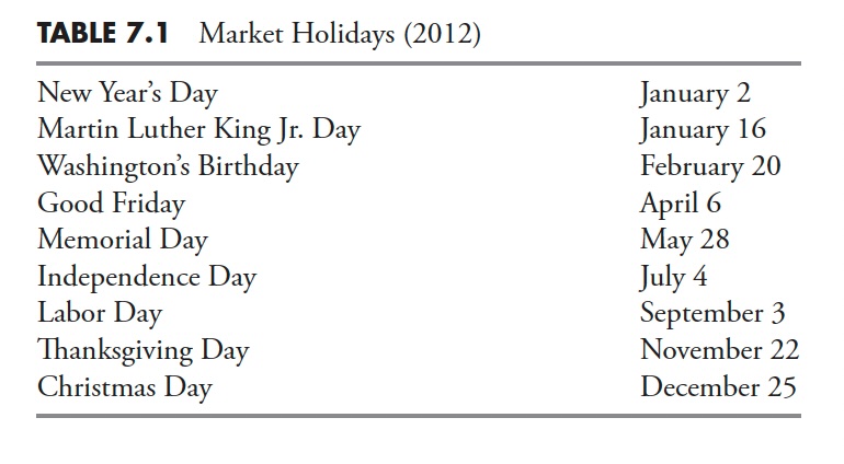 There are 365 calendar days per year (365.25 for leap year consideration). There are five market days per week, so five-sevenths of 365 = 260.7 market days per year. Of course, to include leap year using the same methodology, five-sevenths of 365.25 = 260.9 market days per year. Hence, either 260.7 or 260.9 will round to 261 days per year. Next we need to adjust for market holidays, 261 days – 9 holidays = 252 market days per year. Market holidays (Table 7.1) were obtained from the New York Stock Exchange website.