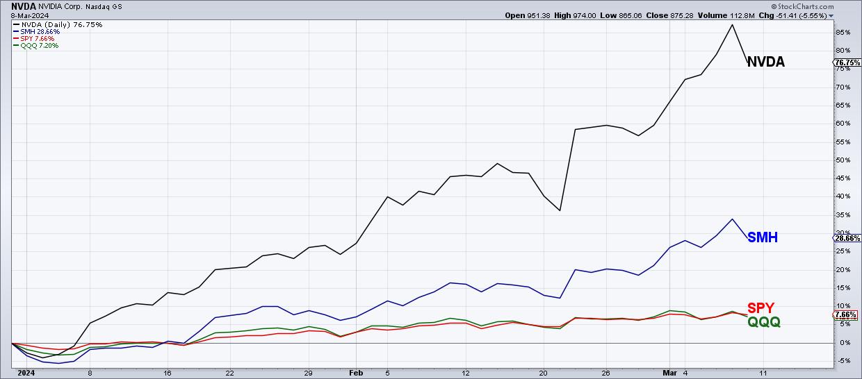 Large-cap growth stocks have been outperforming for quite some time, with semiconductors perhaps the most representative of the strength of that trade in recent months. In fact, the semiconductor ETF (SMH) finished the week up 29% year-to-date, far outpacing the S&P 500 and Nasdaq 100, which are both up about 7.5% in 2024.