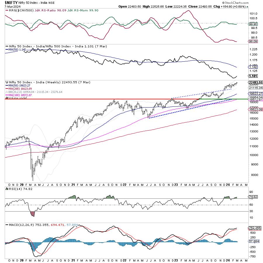 The markets continued to trade on expected lines. The trading week was short as Friday was a trading holiday on account of Mahashivratri. In the four trading sessions, the markets stayed choppy and failed to make any definite and convincing moves while they continued to modestly advance on a weekly basis. The trading range also stayed narrow; the Index oscillated in a defined 301.30-point trading range while staying devoid of directional bias on most occasions. The volatility also dipped; the India VIX declined by 10.65% to 13.61. By and large, while not showing any meaningful upsides, the headline index closed with a net weekly gain of 154.80 points (+0.69%).