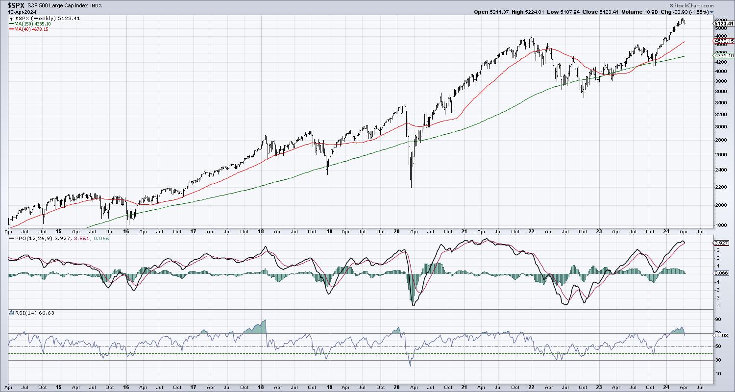 As I checked in on the markets this week during Spring Break, I noticed that the weekly S&P 500 chart showed that the RSI had just broken down out of the overbought region. And while the weekly PPO has not yet registered a sell signal, it finished the week by almost doing so.
