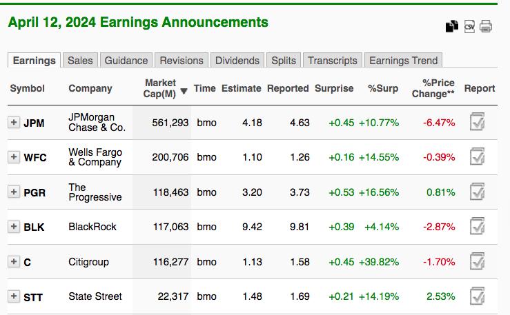 We’ve seen some downside moves in the past of just 1-2% and others, like the correction last summer, that stretched to 10%. I believe earnings will be strong, but the huge move off the October 2023 low may have built in that positive news. You’ve probably heard that old Wall Street adage, “buy on rumor, sell on news”, right? Well, that’s exactly what we saw Friday, with respect to the major financials that reported quarterly results Friday morning. The earnings numbers looked pretty good on Zacks: