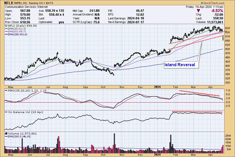 After the gap up in January, price formed a three-month island that drifted higher, but all was not well technically. The falling PMO formed a negative divergence against the rising price. When the PMO falls above the zero line, it is telling us that the strength behind the up move is diminishing.
