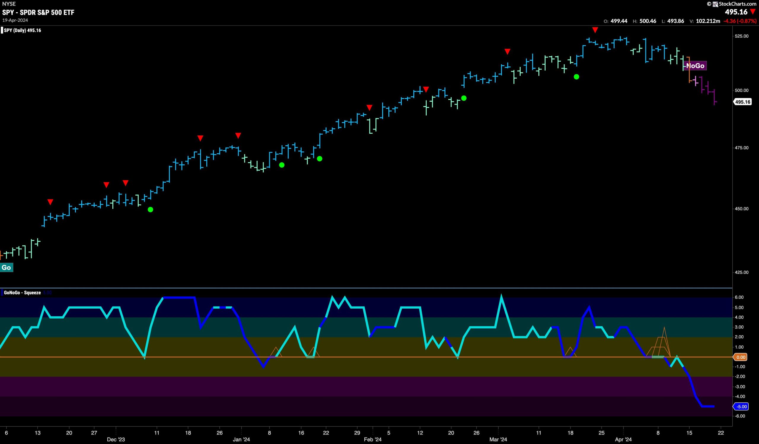 Last week we noted the weakness we had seen in the “Go” trend. The last high triggered a Go Countertrend Correction Icon (red arrow) that indicated prices may struggle to go higher in the short term. Prices moved mostly sideways or away from the high since then and this past week saw the technical environment change. First, an amber “Go Fish” bar reminded us that there was uncertainty in the current trend, and that quickly gave way to a pink “NoGo” bar. Without looking back, the latter part of the week saw strong purple “NoGo” bars as price moved progressively lower.