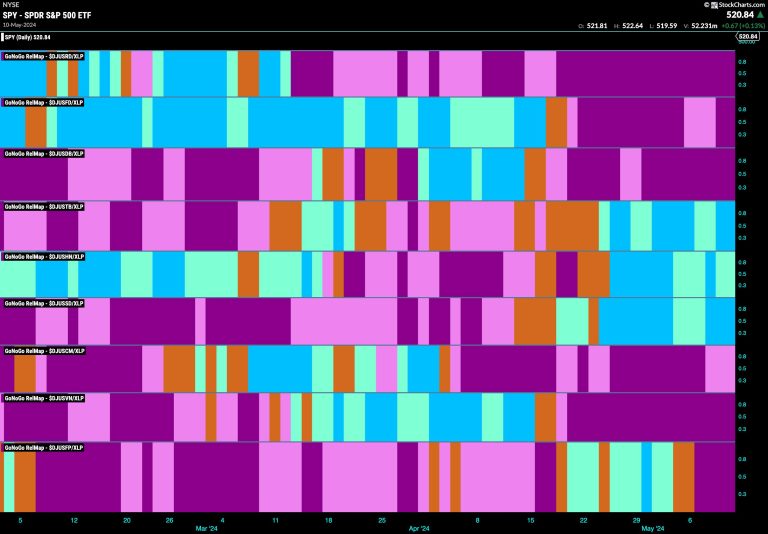 After a week of amber “Go Fish” bars representing uncertainty, we saw a fresh “Go” trend emerge on the last day of the week as GoNoGo Trend painted an aqua bar. This is the first of the “Go” colors, so we will want to see stronger blue bars follow. This came after GoNoGo Oscillator broke out of a Max GoNoGo Squeeze into positive territory. This leading indication of positive momentum was a good sign as it told us that momentum was no longer on the side of the prior “NoGo” trend.