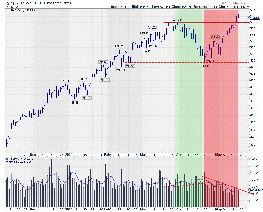 One of the issues is the volume pattern, as can be seen on the above spy chart. The lower pane holds the volume combined with its moving average (the blue line). During the decline from the 525 peak at the end of March all the way down to 494 in the second half of April, the volume rose slightly. So, we had a declining price on rising volume.