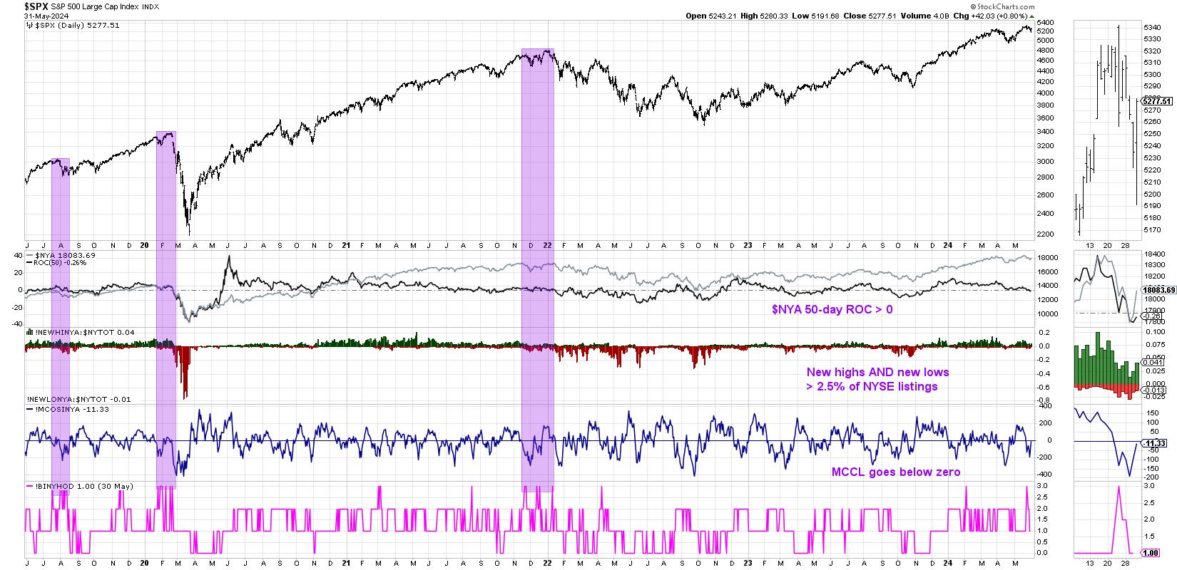 But Miekka’s analysis showed that market tops are usually marked by indecision, and, by looking for a situation where there are a healthy number of both new 52-week highs and new 52-week lows, we can confirm this unstable market state. We can see in the chart that we saw 2.5% of new highs and new lows on the same day earlier in the month of May.