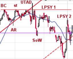 A gap kicks off the final rally into the BC. The AR is the sharpest reaction since Accumulation. BC is seen as future resistance level. A ST and Upthrust After Distribution (UTAD) are rejected at BC resistance level. UTAD often results in aggressive reaction to support. This is a sign of weakness.LPSY-1 is a brief rally of poor quality and is unable to return to BC resistance. SOW reaction follows with expanding and aggressive supply character and breaks the upward trend channel. LPSY-2 has the character of a ‘short covering rally’ which is brief and sharply rising. They normally fail suddenly and weakness resumes.PnF count objective is taken and could become larger.