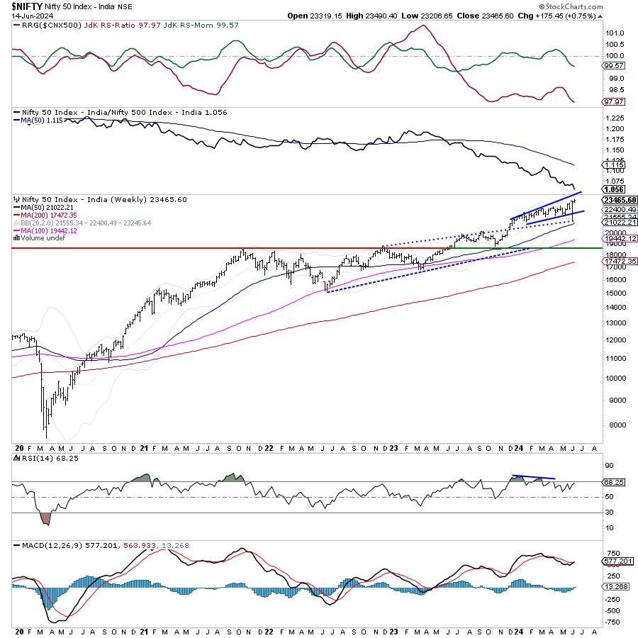 The coming week is a truncated week with Monday being a trading holiday on account of Bakri Eid. The markets have closed at their fresh lifetime highs; however, they remain below the rising channel that was violated. The Index is continuing to mark incremental highs but it is also continuing to resist the lower edge of the channel. Going by the derivatives data, Nifty has strong resistance in the 23550-23600 zone; unless these levels are taken out convincingly, a sustained upmove cannot be expected. Over the coming shortened week, the Nifty may also rise a bit but at the same time, it stays vulnerable to profit-taking from higher levels.