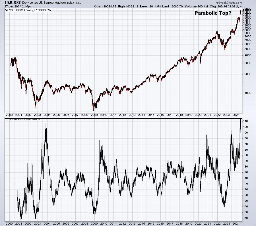 One hallmark of secular bull markets is rotation. When leading stocks, sectors, and industry groups falter, there needs to be others that grab the baton and help to keep the bull market intact. Semiconductors ($DJUSSC) have been the clear leader in the stock market for years, but especially since the end of October 2023, when the group embarked on its most powerful rally of the 21st century. Below is a 25-year chart of the DJUSSC. Pay particular note to the bottom panel, which reflects a 170-day rate of change (ROC), or roughly 8 months. Compare this most recent 8-month rally to other 8-month periods throughout this century: