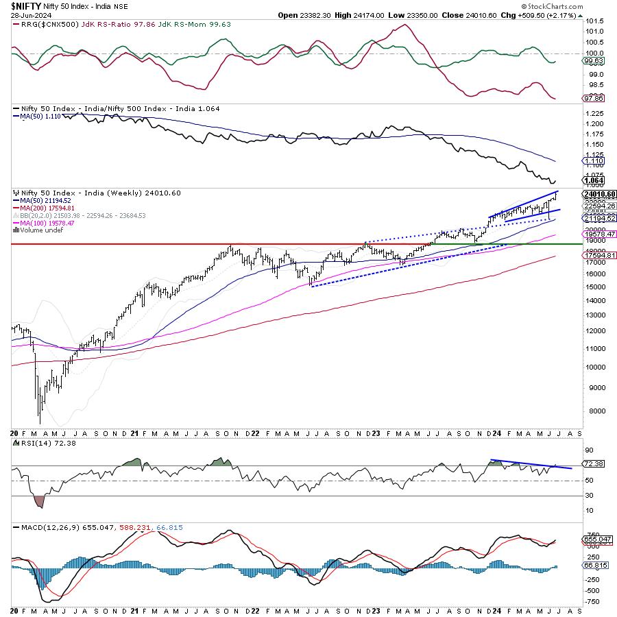 After consolidating in the week before this one, the markets resumed their upmove and have ended the present week on a strong note. The markets also navigated weekly derivatives expiry; it did show some signs of fatigue and impending consolidation on the last trading day after rising for four trading sessions in a row. The trading range got a bit wider; the Nifty oscillated in an 824-point range over the past five days. The volatility also surged a bit; India Vix inched higher by 4.72% to 13.80. After trending through the week, the headline index closed with a net weekly gain of 509.50 points (+2.17%). The month has been even stronger; June ended with Nifty gaining 1479.90 points (+6.57%) on a monthly note.