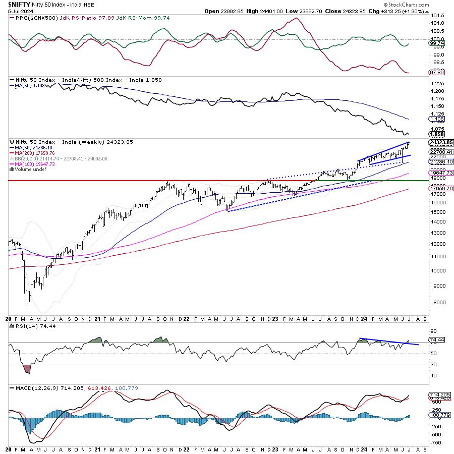 There is also a significant deviation from the mean that is observed as Nifty’s nearest 20-week MA and 50-week MA are as far as 1615 points and 2940 points respectively. This highlights the danger that the markets have even if they make even a little event to revert to their mean or even consolidate in a ranged manner. The weekly RSI is 74.44. It stays overbought and remains neutral without showing any divergence against the price. The weekly MACD is bullish and stays above the signal line.