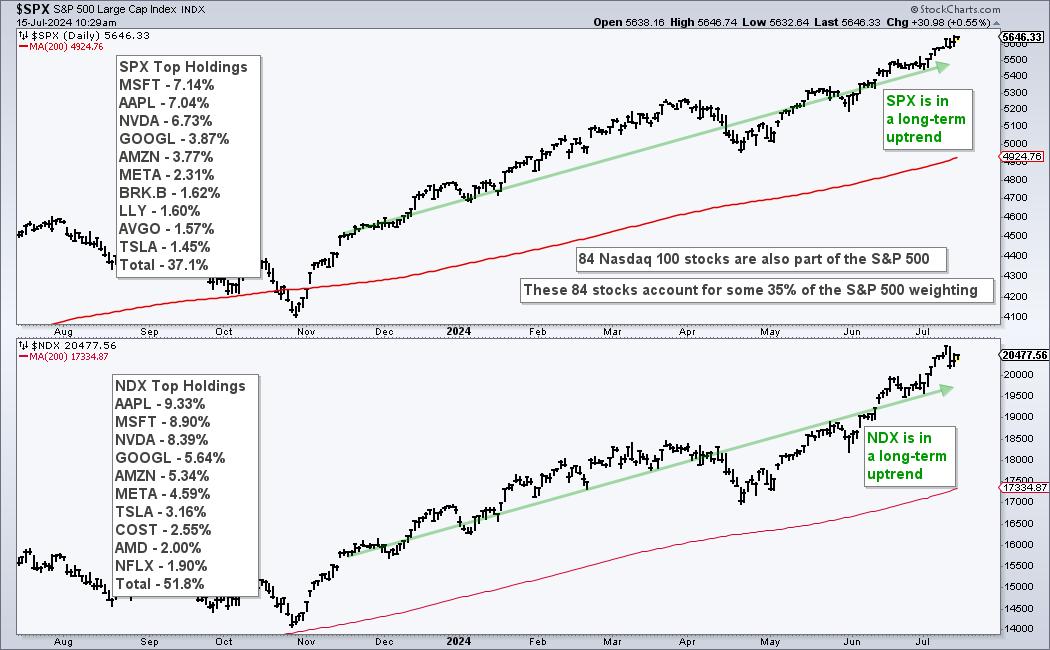 The Nasdaq 100 is a major driver in the stock market and Nasdaq 100 breadth indicators should be part of our broad market analysis routine. 84 Nasdaq 100 stocks (16.8%) are also in the S&P 500 and their weighting accounts for over 30% of the S&P 500. In fact, the six largest stocks in the S&P 500 come from Nasdaq 100 and account for 31.26%. The chart below shows the holdings for each index. Also note that both are in long-term uptrends.