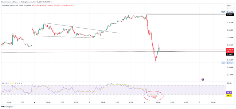 On the 5th Nov 2024 trading session, the AUD/USD can be seen moving upside down slowly. The pair had broken falling wedge patterns and kept moving up. On 6th Nov, just after opening, the price fell sharply and went down nearly -1.80%, near the support zone.