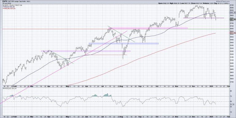 To confirm a head-and-shoulders top, and initiate downside targets on a chart, the price needs to break through the “neckline” formed by the swing lows between the head and two shoulders. While price pattern purists may advocate for a downward-sloping trendline to capture the intraday lows of the neckline, I’ve been focused on the price level of SPX 5850. As long as the S&P remained above that level of support, then the market could still be considered in a healthy bullish phase. But a close below the 5850 level on Friday tells me that this corrective move may just be getting started.