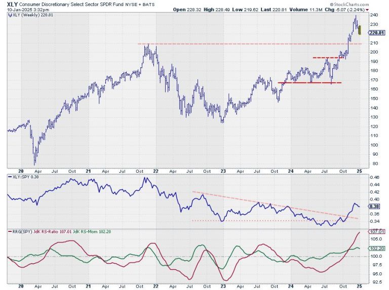 Consumer Discretionary remains well above its breakout level, which took out the peak of 2021. As a result, the sector has some room to decline — say, back to the support area around 210 — without harming the uptrend. This resilience keeps Consumer Discretionary in a very strong position despite the current price decline.