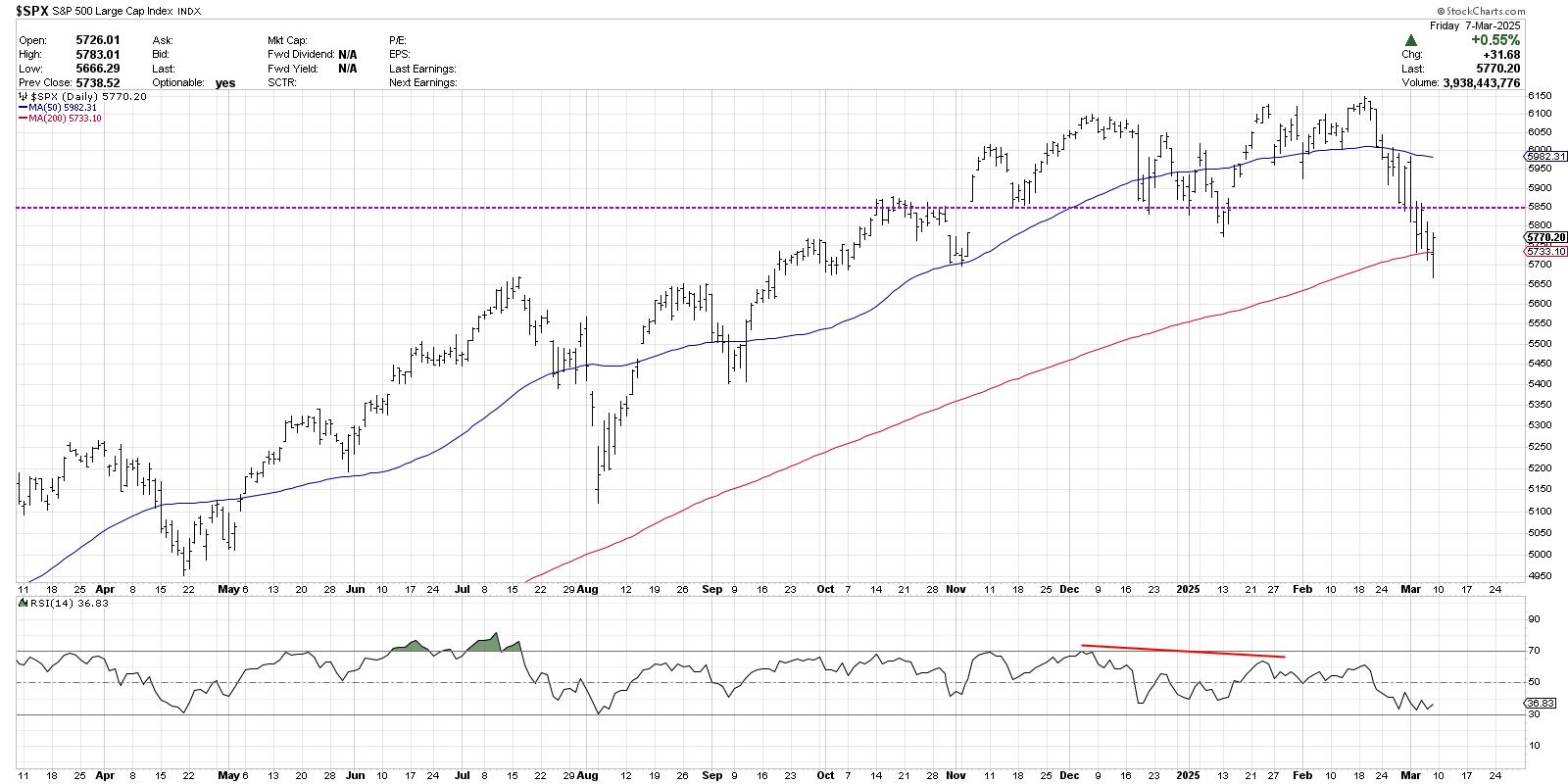 But what if we apply a Fibonacci framework to the last big upswing during the previous bull phase? Using the August 2024 low and December 2024 high, that results in a 38.2% retracement level at 5722, almost precisely at the 200-day moving average. So now we have a “confluence of support” right at this week’s price range.
