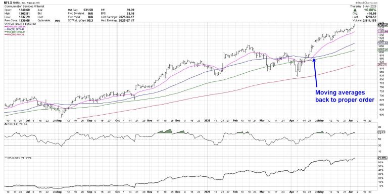 The four moving averages have remained in the proper order as described above for most of the last 12 months. After NFLX pulled back to its April low, a bounce back above the March swing high moved the 21-day exponential moving average back above the 50-day simple moving average. From that breakout point, the stock has continued to push to new all-time highs into early June.